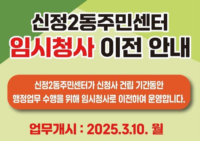 구는 신청사 건립 전까지 공백없는 행정서비스를 제공하기 위해 임시청사를 조성해 3월 10일부터 운영한다. 임시청사 위치는 신정동 118-30이며, 1층은 주차장으로, 2층은 민원실·자치회관 등, 3층은 동대본부로 활용된다.