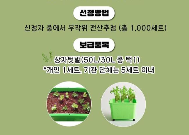 신청 자격은 개인은 1인 1세트, 기관 및 단체는 최대 5세트까지 신청할 수 있다. 상자텃밭 1세트당 비용은 50L 세트 8,600원, 30L 세트 6,200원으로, 이는 상자텃밭 비용의 20%에 해당하는 금액이다.