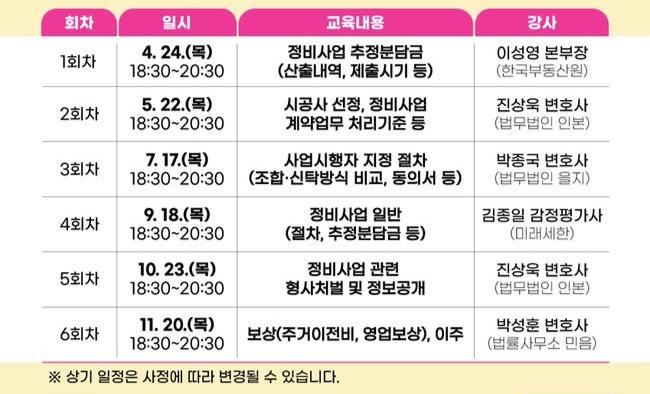 강의는 도시 정비 전문변호사, 한국부동산원, 감정평가사 등 각 분야의 실무 전문가들이 참여해 ▲ 정비사업 추정 분담금 ▲ 시공사 선정 및 정비사업 계약 업무 처리 ▲사업시행자 지정 절차 ▲정비사업(절차 등) ▲정비사업 관련 형사처벌 및 정보공개 ▲ 보상(주거 이전비, 영업보상), 이주 등 정비사업 전반에 걸친 내용으로 진행될 예정이다.
