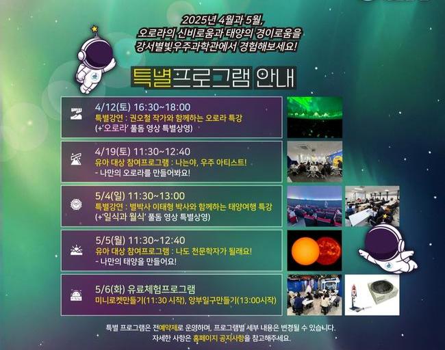 서울 강서구(구청장 진교훈)는 과학의 달과 어린이날을 맞아 4월과 5월 두 달간 `오로라, 그리고 태양` 특별기획전을 개최한다고 밝혔다.