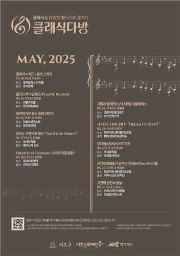 한편 클래식다방은 `클래식을 다양한 방식으로 즐기다`라는 의미를 담은 서초구의 대표 공연 지원사업이다. 국내 유일의 음악문화지구인 서리풀 악기거리와 서초문화벨트 내 소공연장에서 릴레이로 펼쳐지며, 2019년 처음 개최된 이후 누적 관객 5,000여 명을 기록하며 꾸준한 사랑을 받아오고 있다.