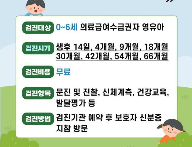 검진 대상은 6세 미만 의료급여수급권자 영유아로, 검진 항목은 성장·발달 이상, 비만 등 주요 선별 목표 질환에 대한 5개 분야(계측, 측정, 문진, 진찰, 교육) 24개 항목으로 구성돼 있다.