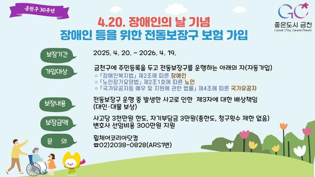 지원 대상은 전동보장구를 이용하는 금천구에 주소지를 두고 있는 장애인과 만 65세 이상 어르신, 국가유공자이고, 별도의 신청 절차 없이 자동으로 가입된다.