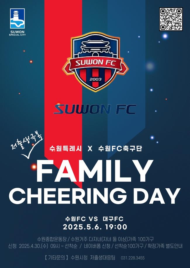 이번 관람 지원 경기는 5월 6일 열리는 수원종합운동장에서 열리는 수원 FC 대 대구 FC의 축구 경기다. 4월 30일 오전 9시부터 다자녀 가구 100가구를 대상으로 선착순 신청을 받는다. 홍보물 포스터에 있는 큐아르(QR) 코드에 연결된 웹페이지에서 신청하면 된다.