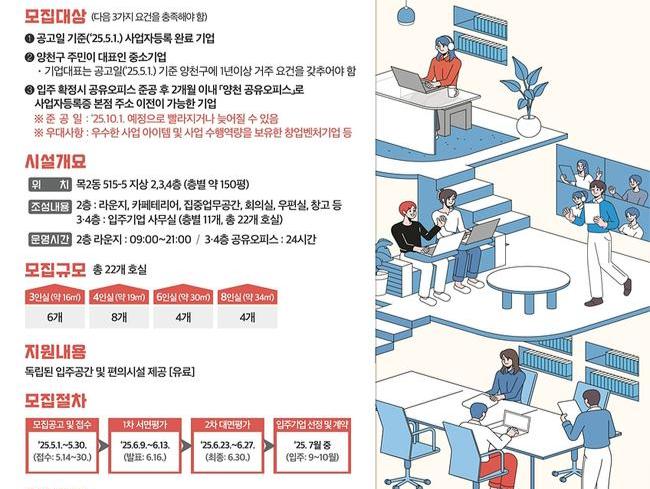 모집 대상은 공고일인 5월 1일 기준 사업자등록이 완료되고, 대표자가 구에 1년 이상 거주 중인 양천구민이어야 하며, 입주 확정 시 공유오피스 준공 후 2개월 이내에 사업자등록증 본점 주소 이전이 가능한 기업이다. 1차 서류 심사, 2차 대면 심사를 통해 총 22개 기업이 선정되며, 우수한 사업 아이템과 사업 수행 역량을 보유한 창업기업은 선발 시 우대한다.