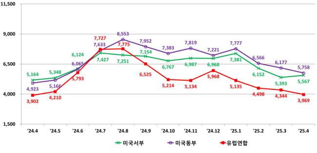 2025년 4월 수출입 운송비용, 항로 따라 혼조세 보여
