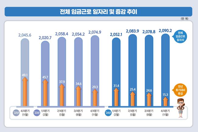2024년 4분기 전체 임금근로 일자리는 전년 같은 기간보다 15만3천개 늘어난 2,090만2천개로 집계됐으며, 보건 · 사회복지와 여성 및 고령층 고용 증가가 주요 요인으로 나타났다.