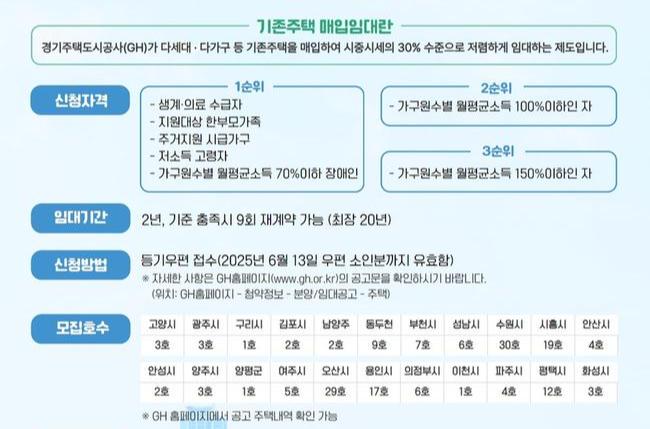 경기주택도시공사(GH)는 경기도 내 취약계층의 주거안정을 위해 매입임대주택 입주자를 모집한다고 26일 밝혔다.
