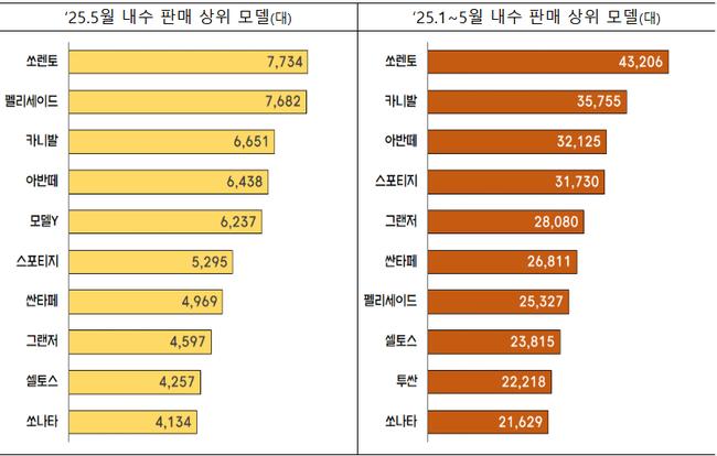 승용차 모델별 내수 판매량 순위