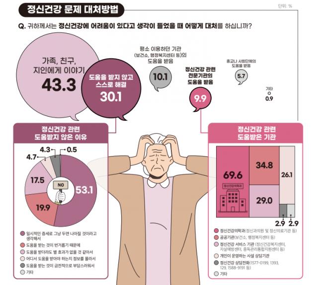 흥미로운 점은 정신적 어려움을 경험한 노인의 절반 이상이 ‘가족, 친구, 지인에게 이야기하는 방법(43.3%)’으로 대처하고 있다는 것이며, 정신건강 전문기관의 도움을 받는 비율은 10명 중 1명에 불과했다. 특히 53.1%는 ‘일시적인 증세이므로 그냥 두면 나아질 것이라고 생각해서’ 도움을 받지 않았다고 응답했다.
