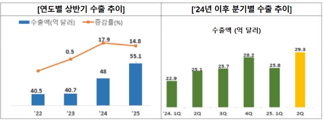 분기별로는 1분기 25.8억 달러, 2분기 29.3억 달러를 기록해 각각 전년 대비 12.7%, 16.8% 증가했다. 특히 2분기 수출액은 역대 최대치였던 2024년 4분기(28.2억 달러)보다도 3.9% 증가하며 새로운 기록을 세웠다.