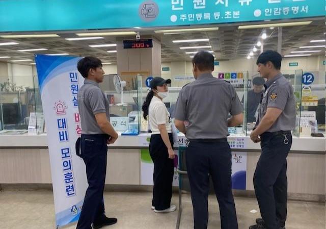 비상 상황 대응 지침에 따라 훈련 내용은 ▲상급자 적극 개입 및 진정 유도 ▲휴대용 영상음성기록장치(웨어러블 캠) 활용 녹화·녹음 ▲민원실 퇴거 요청 ▲청원경찰 및 비상벨(112상황실 연결) 호출 ▲피해공무원 보호 및 타 민원인 대피 ▲민원인 제지 및 경찰 인계 등의 순서로 구성됐다.