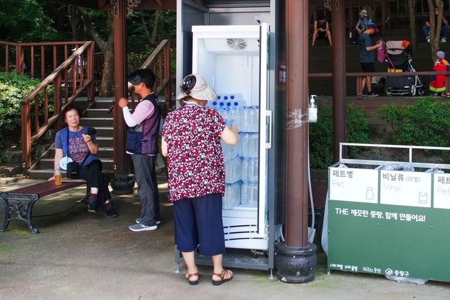 중랑구 관내 생수 냉장고 `중랑옹달샘`을 이용하는 시민의 모습.