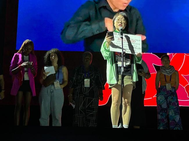 12월 5일 오후 제15회 AWID(The Association for Women`s Rights in Development) 국제 포럼 폐막식에서 공동성명과 연대 행동을 제안하고 있는 한국 참가자들 (사진=성적권리와 재생산정의를 위한 센터 셰어 SHARE 제공)