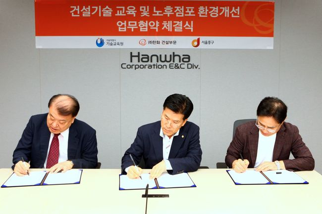 서울 중구가 한화 건설부문, 서울특별시 기술교육원과 협력해 노후 점포를 개선하고 소상공인 경쟁력 강화를 지원하기 위한 업무 협약을 체결했다.
