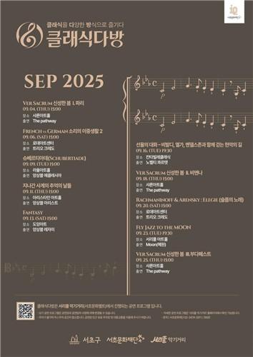 서울 서초구(구청장 전성수)는 서초문화재단(대표이사 강은경)과 함께 9월 한 달간 국내 유일의 음악문화지구인 서리풀 악기 거리 내 소공연장에서 `2025 클래식다방` 공연을 개최한다고 밝혔다.