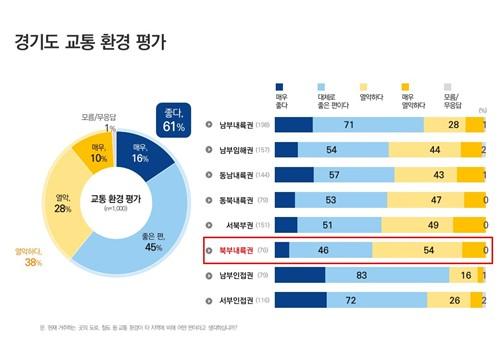 현재 교통환경에 대해서는 응답자의 61%가 `좋다`고 평가했으며, 최근 3년간 교통환경이 `좋아졌다`고 응답한 비율은 76%에 달했다. 특히 북부내륙권(의정부·양주·동두천·포천·연천)의 경우 현재 만족도는 46%로 상대적으로 낮았지만, 최근 3년간 교통환경이 개선됐다는 응답이 86%로 높게 나타나 도민들이 정책 효과를 체감하고 있는 것으로 분석됐다.