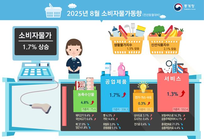 통계청에 따르면 8월 소비자물가지수는 전월 대비 0.1% 하락했으나, 지난해 같은 달과 비교하면 1.7% 상승했다. 전년 동월 대비 상승에는 서비스, 공업제품, 농축수산물, 전기·가스·수도의 가격이 모두 오른 영향이 작용했다.