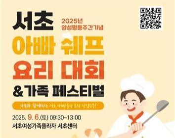 서울 서초구(구청장 전성수)는 오는 9월 6일(토), 서초여성가족플라자 서초센터에서 `서초 아빠 쉐프 요리대회 & 가족 페스티벌`을 개최한다고 밝혔다.