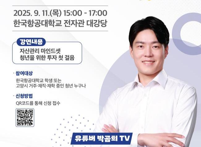 고양특례시(시장 이동환)가 오는 11일(목) 오후 3시 한국항공대학교 전자관 1층 대강당에서 86만 구독자를 보유한 금융 유튜버이자 베스트 셀러 작가인 `박곰희TV`를 초청해 명사특강`한번 배워서 평생 써먹는 자산관리 방법`을 개최한다고 밝혔다.