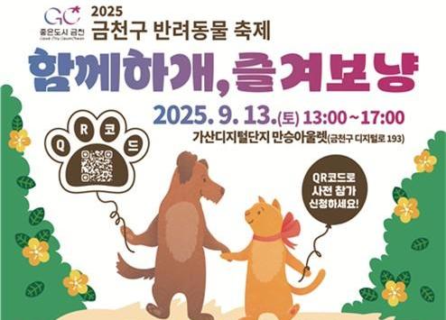 금천구(구청장 유성훈)는 9월 13일 오후 1시 가산G밸리 만승아울렛(금천구 디지털로 193)에서 2025년 반려동물 축제 `함께하개, 즐겨보냥`을 개최한다고 밝혔다.