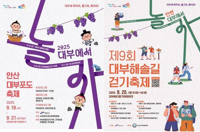 가을철 주요 행사로는 2025년 안산대부포도축제(9.19.∼9.21.)를 비롯해 ▲제9회 대부해솔길 걷기축제(9.20.) ▲제6회 김홍도축제(10.24.∼10.26.) ▲2025년 안산 사이언스밸리(ASV)과학축제(11.1.∼11.2.) 등이 예정돼 있다.