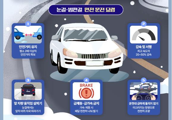 빙판길 사고를 예방하려면 차량 운행 전, 기상과 도로 상황을 확인하고 결빙이 발생하기 쉬운 구간에서는 감속 운전을 해야 한다.