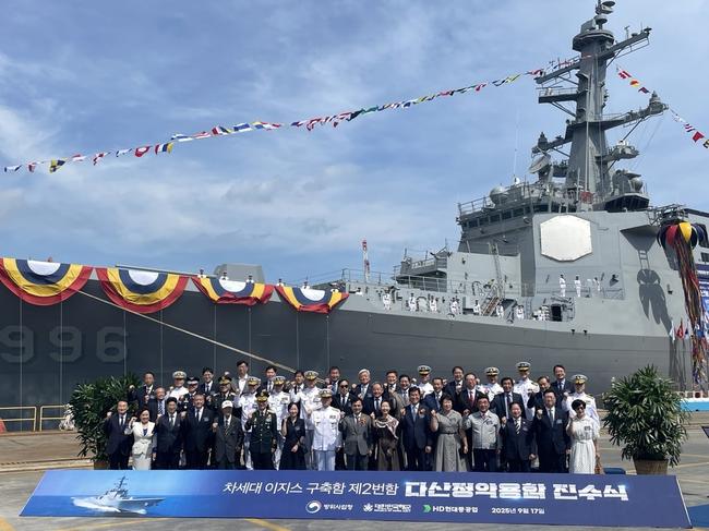 주광덕 남양주시장은 17일 울산 HD현대중공업 조선소에서 열린 차세대 이지스 구축함 `다산정약용함` 진수식에 참석했다. `다산정약용함`은 정조대왕급(KDX-Ⅲ Batch-Ⅱ) 2번함으로, 첨단 전투체계를 갖춘 대형 해군 구축함이다.