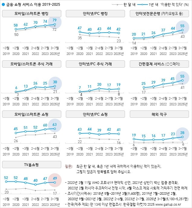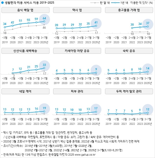 • 한국갤럽 ‘마켓70 2025’ 조사, 금융·쇼핑·생활편의·미용 서비스 19종 이용률 공개