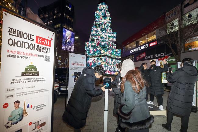 KT(대표이사 김영섭)가 서울 신촌 거리에 11m 크기의 초대형 미디어 트리를 설치하고 고객이 제안한 일상 속 AI 아이디어를 광고로 만들어 송출하는 `팬메이드 K-AI 아이디어 챌린지` 오프라인 팝업을 1월 5일까지 운영한다고 밝혔다.