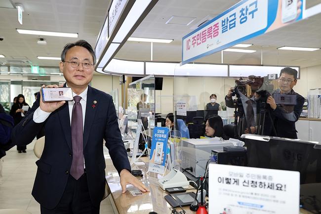 고기동 행정안전부 장관 직무대행이 27일 오전 세종특별자치시 나성동 주민센터에서 스마트폰에 주민등록증을 담은 모바일 주민등록증을 직접 발급 받아 보이고 있다. 행정안전부는 12월 27일(금)부터 9개 지자체*에서 모바일 주민등록증 시범 발급을 시작했다. * (광역) 세종, (기초) 강원 홍천군, 경기 고양시, 경남 거창군, 대전 서구, 대구 군위군, 울산 울주군, 전남 여수시, 전남 영암군