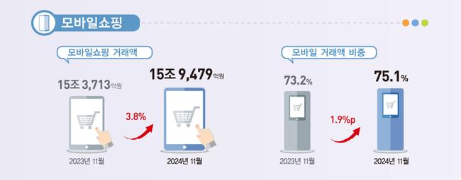 모바일 쇼핑 거래액은 15조 9,479억 원으로 전년 동월 대비 3.8% 증가하며 온라인쇼핑 거래액의 75.1%를 차지했다.