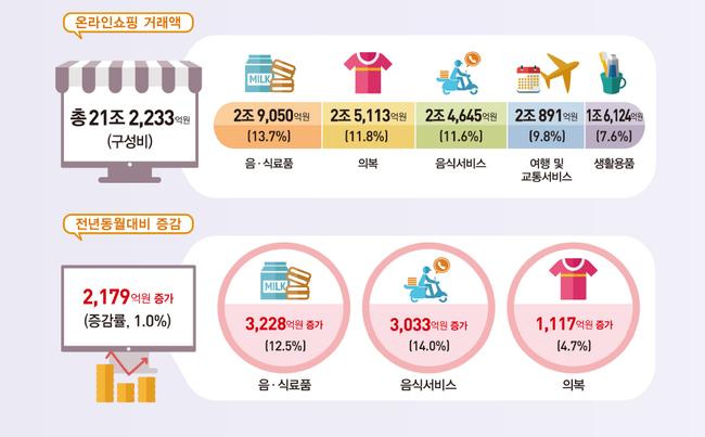 상품군별로는 음·식료품(12.5%), 음식 서비스(14.0%), 의복(4.7%)에서 거래액 증가세를 보였으며, 이 중 의복 거래액은 코리아세일페스타와 같은 대형 할인행사 효과로 역대 최대치인 2조 5,113억 원을 기록했다.